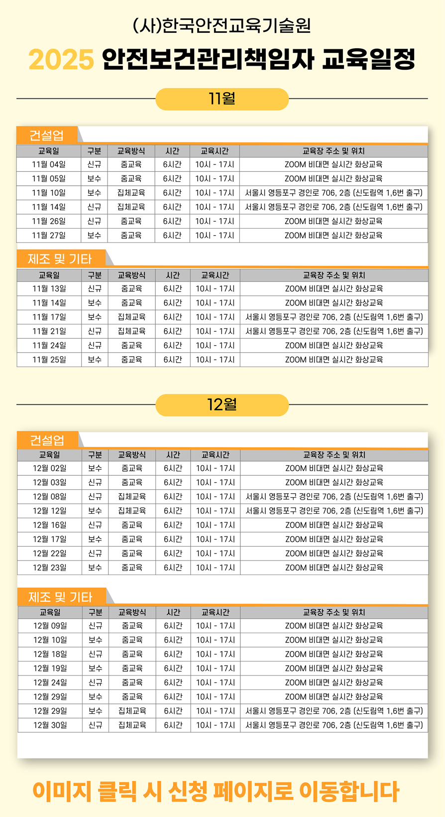 관리감독자(집체/ZOOM) 위험성평가담당자 안전보건관리책임자 안전관리자 안전관리전문기관종사자 건설재해예방기관종사자 보건관리자 보건관리전문기관종사자