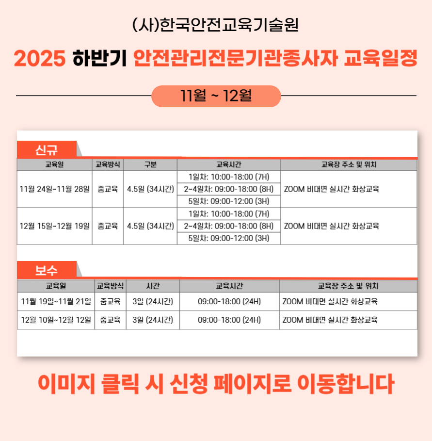 관리감독자(집체/ZOOM) 위험성평가담당자 안전보건관리책임자 안전관리자 안전관리전문기관종사자 건설재해예방기관종사자 보건관리자 보건관리전문기관종사자