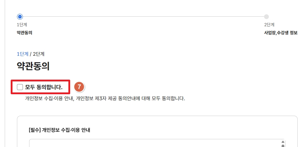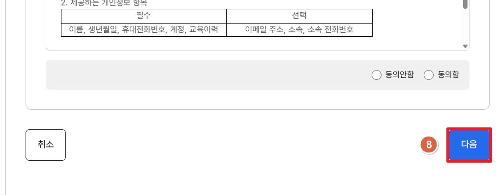 7. 교육신청 후 [개인정보제공 모두동의] 클릭 후 아래로 내려 [다음] 클릭