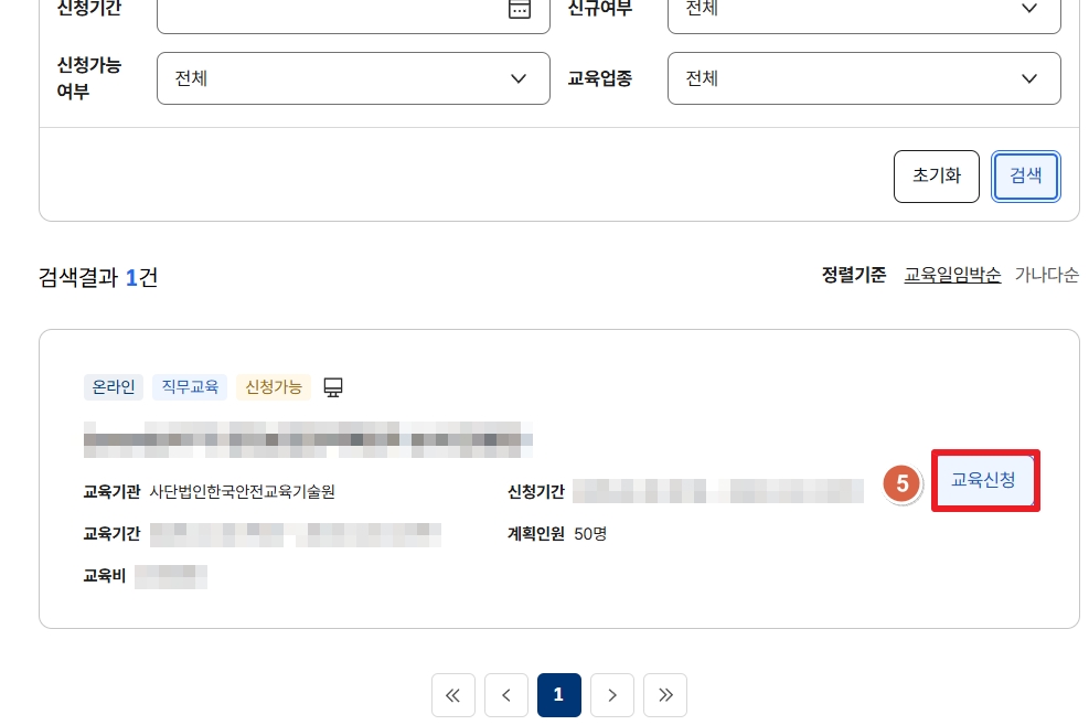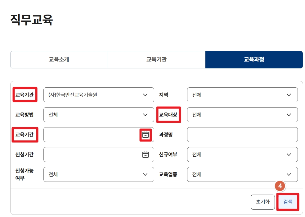 [교육기관] [교육기간] [교육대상]을 체크 후 검색 클릭 (↓이미지 아래 설명확인)